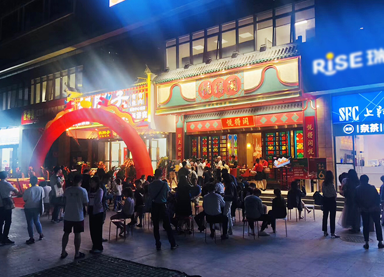 8、門頭形象:門頭是品牌的臉面,也是顧客接觸我們的第一個(gè)場景。門頭形象具有廣而告之的作用,門頭代表著餐廳的名字叫什么,賣的產(chǎn)品是什么,這是最基本且不可或缺的要素。門頭完全可以作為全方位展示店特色的工具,巧妙的組合可用信息向客戶發(fā)送品牌信息,從而引發(fā)客戶興趣。悅得閑廣式點(diǎn)心茶樓的門頭大量使用鑊耳山墻,讓廣式茶樓的特性展露無遺。