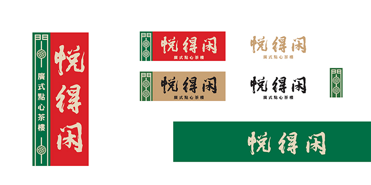 因此,悅得閑的logo我們使用圖形加文字的形式。大紅色的底色上用金色的品牌字,傳遞一種茶樓出品的品質(zhì)感,表示金字招牌之意。左側(cè)綠色色塊上一個原創(chuàng)圖形,取自于得閑飲茶的閑字,將閑字變形,用點心蒸籠的圖形填充,表明了品類屬性也傳達了得閑飲茶的文化IP。