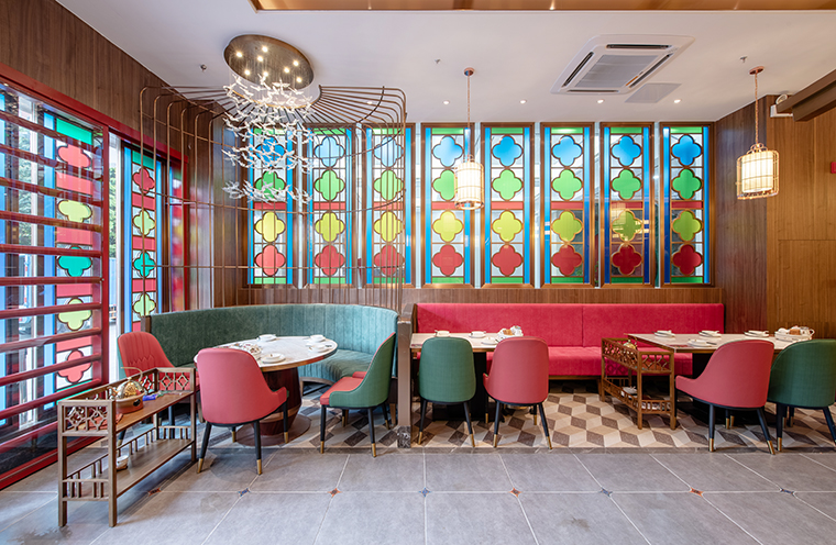 中,我們將廣式花窗大面積使用在正面形象,進門口,包房隔斷等,形成了強烈的視覺沖擊力,具有鮮明的品牌感。