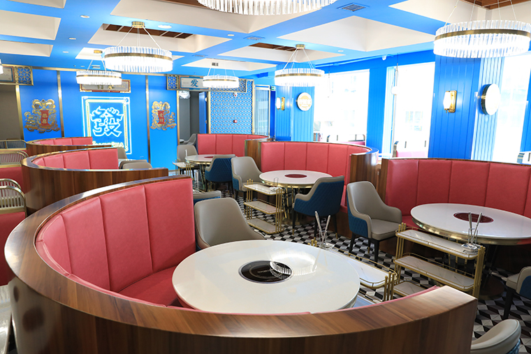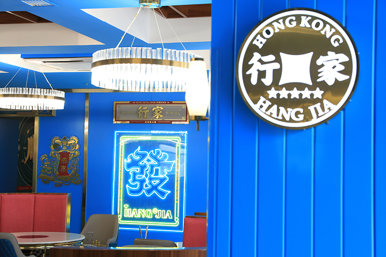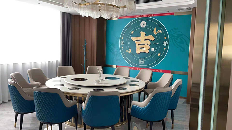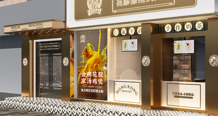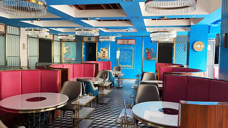 行家花膠雞港式打邊爐餐廳在顏色設(shè)計(jì)上結(jié)合品牌色,大面積使用不銹鋼金色,藍(lán)綠色,暗紅色,將餐廳打造成主題風(fēng)格截然不同的港式餐廳,同時(shí)融入具有地域風(fēng)情的港式風(fēng)味,在文化元素上植入恭喜發(fā)財(cái),順、發(fā)、喜等傳統(tǒng)香港吉祥話語(yǔ)元素,傳統(tǒng)與現(xiàn)代的元素融合在餐飲空間中,突破了人們對(duì)傳統(tǒng)港式餐廳的認(rèn)知,重新定義新派港式打邊爐餐廳的基調(diào)。