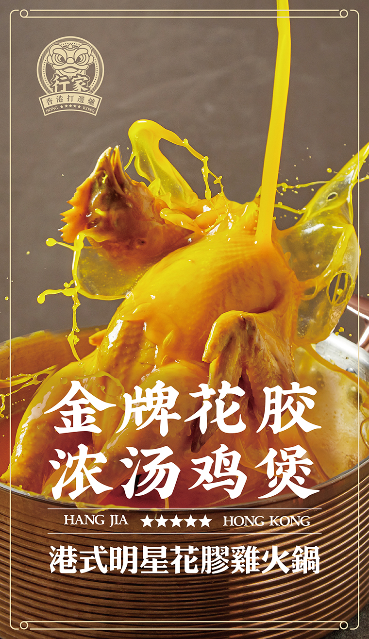 通過(guò)多次對(duì)比,標(biāo)志顏色主色調(diào)我們選擇用金色,金色源于菜品花膠雞湯汁的顏色,多種食材和調(diào)料熬制的金色湯汁配上整只走地雞+上好的花膠,吃起來(lái)很滿足。