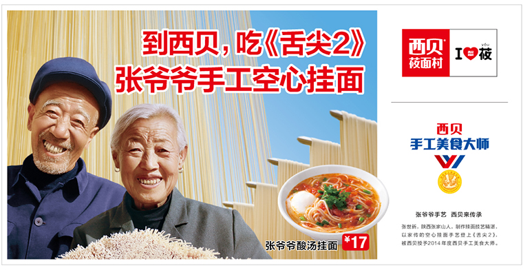 西貝莜面村與“舌尖上的中國”里張爺爺空心掛面的創(chuàng)始人合作,對外宣傳“吃張爺爺空心掛面,感受舌尖上的味道”。