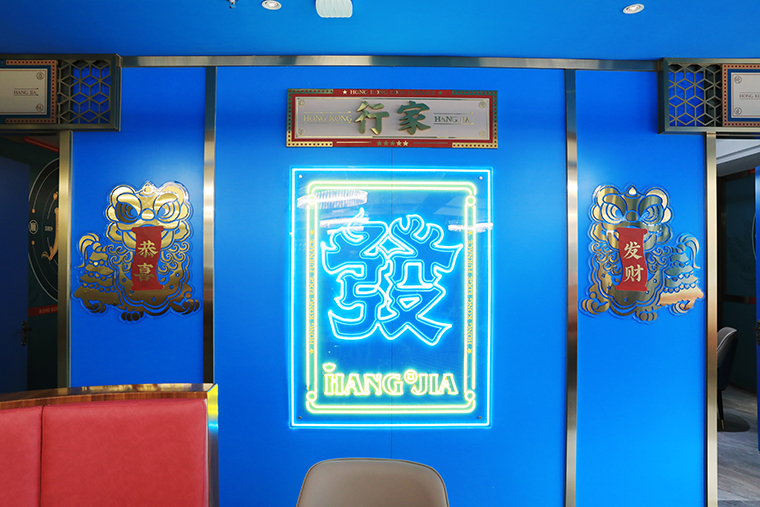 餐廳的主入口處,人流最密集之地,也是品牌首選的亮相之處。展現品牌主形象LOGO,以香港常見的霓虹燈材質,四周放射性線條,極具識別度,既有鮮明的港式風格,又能吸引消費者打卡拍照分享;上樓梯處再用不銹鋼金屬字強調品牌名字“我就是行家”;1樓大廳一整面墻的香港城市景色照片,讓消費者有一種身臨其境的感受;二樓大廳正面形象墻以行家牌匾+立體浮雕醒獅,最經典的港式匾額傳達花膠雞悠久厚重的歷史,兩側喜慶的南派醒獅,吉祥又可愛,與品牌LOGO彼此呼應。