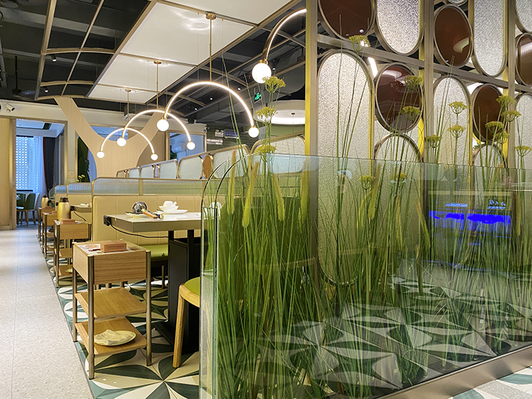 除了品牌的畫面及文案宣傳外,我們如何在空間裝飾方面突出這一核心賣點呢?我們想到了磨砂玻璃這一材質,在餐廳立面的隔斷、包間的墻體,我們使用了磨砂玻璃及玻璃方磚,這種材料在燈光照耀下,有一種晶瑩剔透的感覺,用裝飾材料特性表現菜品清湯這一核心特征,打造出時尚清新,通透舒適的空間感受。