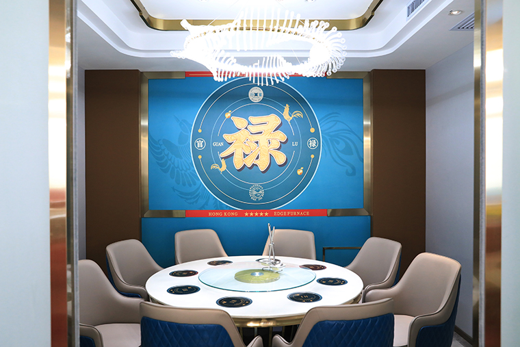 整體氛圍去掉繁雜多余的線條,多用皮質,不銹鋼材質,呈現精致,高品質的用餐氛圍!空間的整體照明燈光以柔和面光為主,餐桌上方局部聚光燈照明,突出火鍋湯底的特色,金黃明亮;特色的吊燈,讓空間層次鮮明,港風濃郁。家具以皮革為主,金屬收邊,加上小屏風讓空間感更通透,能表達出輕奢的質感。